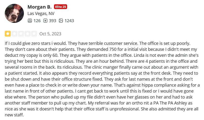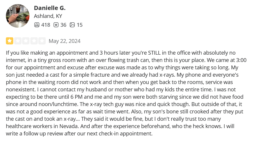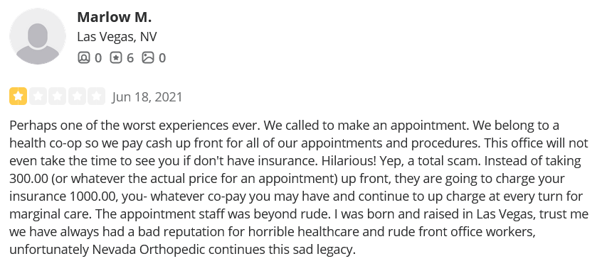 On Yelp, Nevada Orthopedic has 2.4 stars, but keep in mind that 42% of positive reviews are fake, so the rating is likely much lower. A few of the negative comments are displayed at the bottom of this page. Go to Yelp to learn more about the bad experiences at Nevada Orthopedic.
