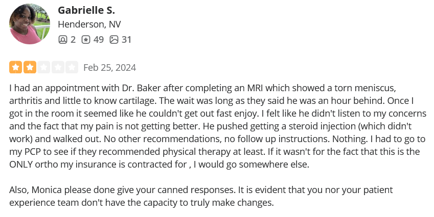 - Bradley Baker (only 3 reviews on Yelp after 30 years as a doctor). Read one of the patient stories of harm and bad treatment by Dr. Baker:
