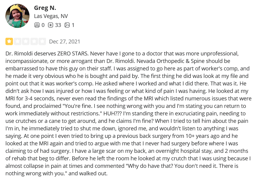 - Reynold Rimoldi (only 25 reviews on Yelp with a rating of 1.3 stars, after 36 years as a doctor). Read some of the patient stories of harm and bad treatment by Dr. Rimoldi.