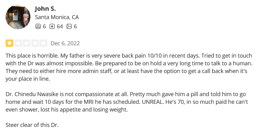 - Chinedu Nwasike (only 1 review on Yelp after 11 years as a doctor)