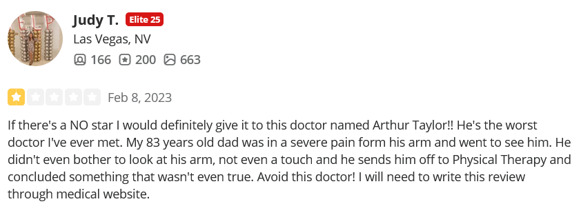 - Arthur Taylor(only 1 review on Yelp after 37 years as a doctor)