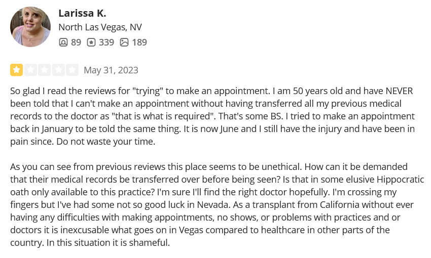 Remember that businesses (including doctors) will often delete their Yelp page when they get too many negative reviews. See below for the statistics relating to the doctors at Nevada Orthopedic, including Dr. Michael Bradford who shows only 3 reviews on Yelp even though he has been a doctor for 39 years. It is very telling that the doctors at Nevada Orthopedic have no reviews or only a small number of reviews on Yelp (even though most of them have been practicing medicine for many years).