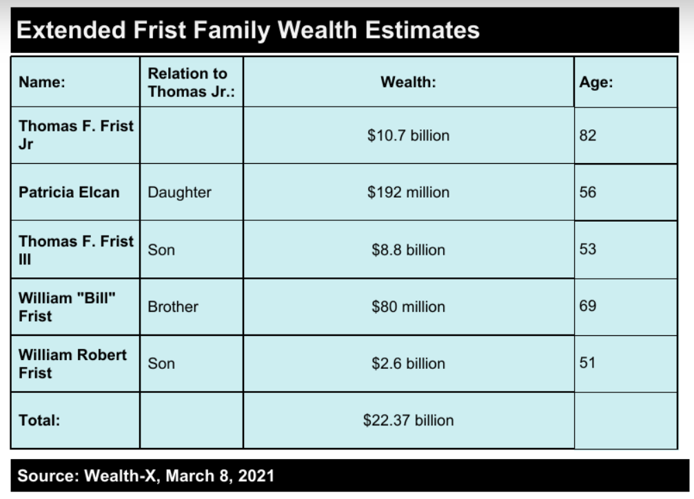 The extended Frist family has a combined net worth of $22.37 billion. The list of the "extended family" includes: Thomas Frist Jr, his brother William Harrison Frist, his daughter Patricia Frist Elcan, his son Thomas F. Frist III, and his other son William Robert Frist.